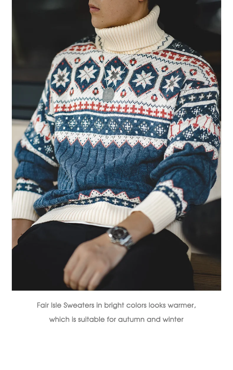 Pullover vintage nordique à col roulé orné de majestueuses étoiles à huit branches, symbole viking de protection et de navigation. Ce vêtement scandinave authentique arbore des médaillons bleu marine, des motifs géométriques rouge brique et noirs sur fond écru. Son tricot jacquard épais offre une chaleur exceptionnelle, tandis que son col roulé généreux protège des vents glacials. Un pullover qui allie héritage viking, élégance nordique intemporelle et confort légendaire pour traverser l’hiver avec style.